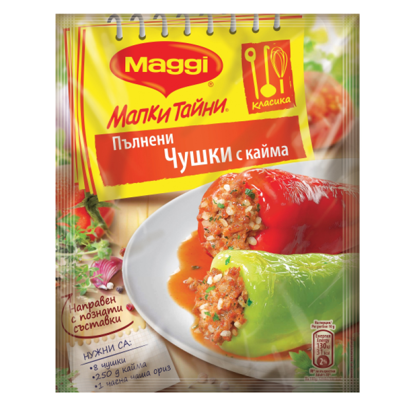 Съставки: Изсушени зеленчуци 40,5% (домати на прах, моркови, лук, целина, чесън на прах, магданоз),декстроза, сол, подправки 12.2% (сладък червен пипер, чубрица, риган, босилек, черен пипер, кимион, мащерка), пшенично брашно,изсушен екстракт от мая (екстракт от мая, сол),слънчогледово масло. Може да съдържа мляко, яйца, соя и риба. Може да съдържа мляко, яйца, соя и риба.
