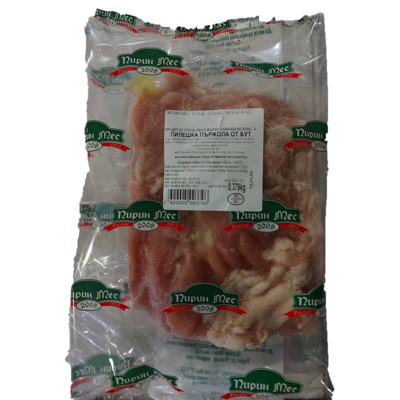 Съставки: пилешко месо от бут без кост с кожа, сол, вода 20%, стабилизатор Е451, киселинен регулатор Е500, антиоксидант Е331, декстроза. Метод на охлаждане: водно чрез потапяне.