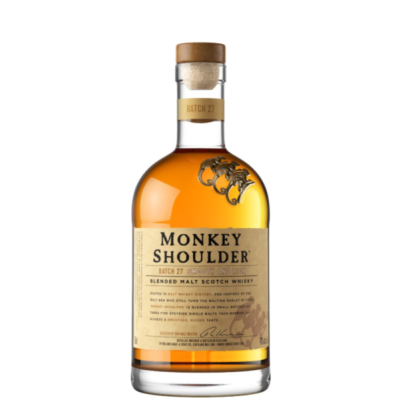 Уиски Мънки Шоулдър 700мл Бач 27 е смес от три единични малцa, от трите най-добри дестилерии в Speyside - Glenfiddich, Balvenie и Kininvie. Всяко едно от уискитата отлежава в бърбън бъчви. За бленда са избрани 27 барела за по-нататъшно смесване. Уискито се бутилира с уникален дизайн - отстрани на бутилката са разположени три месингови маймуни, символизиращи единството на трите малцови компонента и ръчния труд на работниците, които обръщат малца. Аромат: богат ванилов аромат с нотки на дъб, индийско орехче и канела. Вкус: плодове (праскова и кайсия), мед и флорални нотки, с мек, сладък послевкус. Финал: средно дълъг, изключително мек.
