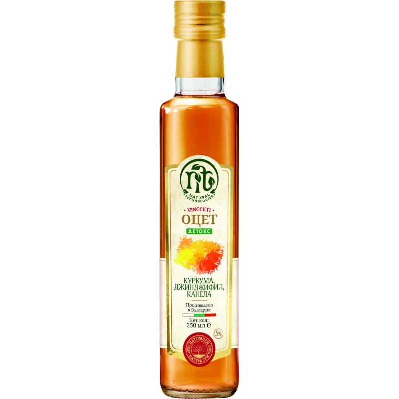 Детокс оцетът е най-новото и уникално попълнение сред Vinoceti вкусовете. Създаден на основата на ябълков оцет с джинджифил, куркума и канела, той е подходящ за директна консумация (до 1-2 ч.л.) и за част от ежедневното детокс меню. Освен с полезните си съставки, очарова и с характерния си аромат и свежата нотка на джинджифил. Финалният щрих, който детокс оцета придава на всяко ястие се отличава с наситения вкус на подправки, които превръщат всяко ястие в истински шедьовър. Детокс вкусът на този оцет е идеален за всички зелени салати, салати с киноа или ядки, както и за зеленчукови смутита. Канеленият привкус го прави подходящ и за маринати на червени меса.
