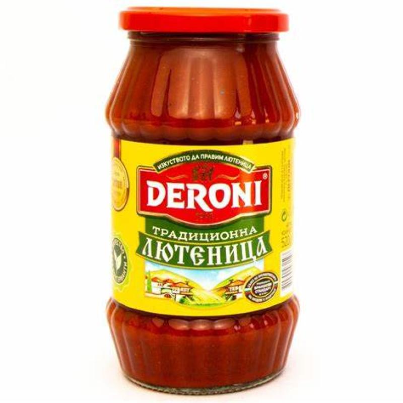 Фино смляна лютеница от сладки печени, белени чушки и домати. Състав: Пиперково пюре, доматено пюре, захар, слънчогледово масло, питейна вода, нишесте, сол, кромид лук, натурални подправки. Лютеница Deroni традиционна 260g Хранителни стойности за 100 г Енергийност (ккал/ kJ) 156/ 655 Въглехидрати (г) 18 от които захари (г) 14 Мазнини (г) 9,5 от които наситени (г) 1,0 Протеини (г) 2,1 Сол (г) 1,4