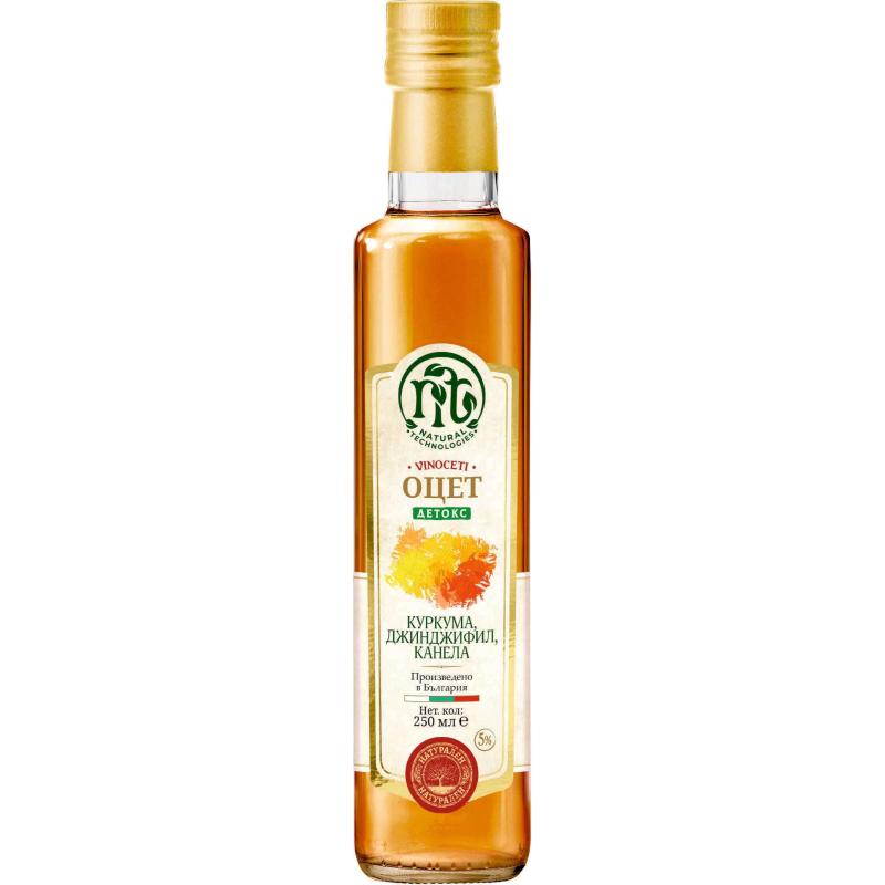 Детокс оцетът е най-новото и уникално попълнение сред Vinoceti вкусовете. Създаден на основата на ябълков оцет с джинджифил, куркума и канела, той е подходящ за директна консумация (до 1-2 ч.л.) и за част от ежедневното детокс меню. Освен с полезните си съставки, очарова и с характерния си аромат и свежата нотка на джинджифил. Финалният щрих, който детокс оцета придава на всяко ястие се отличава с наситения вкус на подправки, които превръщат всяко ястие в истински шедьовър. Детокс вкусът на този оцет е идеален за всички зелени салати, салати с киноа или ядки, както и за зеленчукови смутита. Канеленият привкус го прави подходящ и за маринати на червени меса. Ефирен канелен цвят. Състав: 5% об. киселинност, алкохолно съдържание: 0.3 об.%