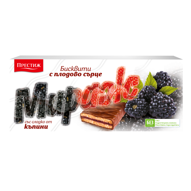 Съставки: ПШЕНИЧНО брашно, сладко от къпини(23%(къпини 8%, глюкозо фруктозен сироп, захар, желиращ агент- пектин, регулатор на киселинността - лимонене киселина, консервант - калиев сорбат, ароматизнати, натурални оцветители- антоцианини), захар, нехидрогенирани растителни мазнини(мазнини- палмова, ший, емулгатори: моно и диглицериди на мастни киселини, :ароматизант, оцветител - бета каротин), частично хидрогенирани растителни мазнини (мазнини:палмова, СОЕВА, рапична, слънчогледова:емулгатори -сорбитан тристеарат и СОЕВ лецитин), какао на прах с намалено маслено съдържание