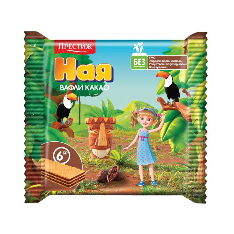 Състав: захар,нехидрогенирани растителни мазнини, пшеничено брашно,какао на прах с намалено маслено съдържание, суроватка на прах, картофено нишесте, царевично нишесте, пшеничено малцово брашно, пастьоризиран яйчен меланж, регулатор на киселинността, набухватели,сол, ароматизант.Може да съдържа следи от сусамово семе, фъстъци, соеви продукти, мляко и ядки.