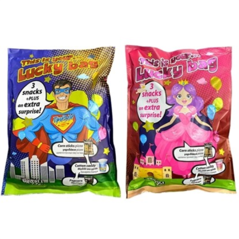 Съдържание: съдържа пакет царевични пръчици“Гризли“ с вкус на пица 45г ;пакет пуканки „Гризли“ 33г ;захарен памук ‚Гризли“ 20г с вкус на банан и играчка за момче/ момиче.