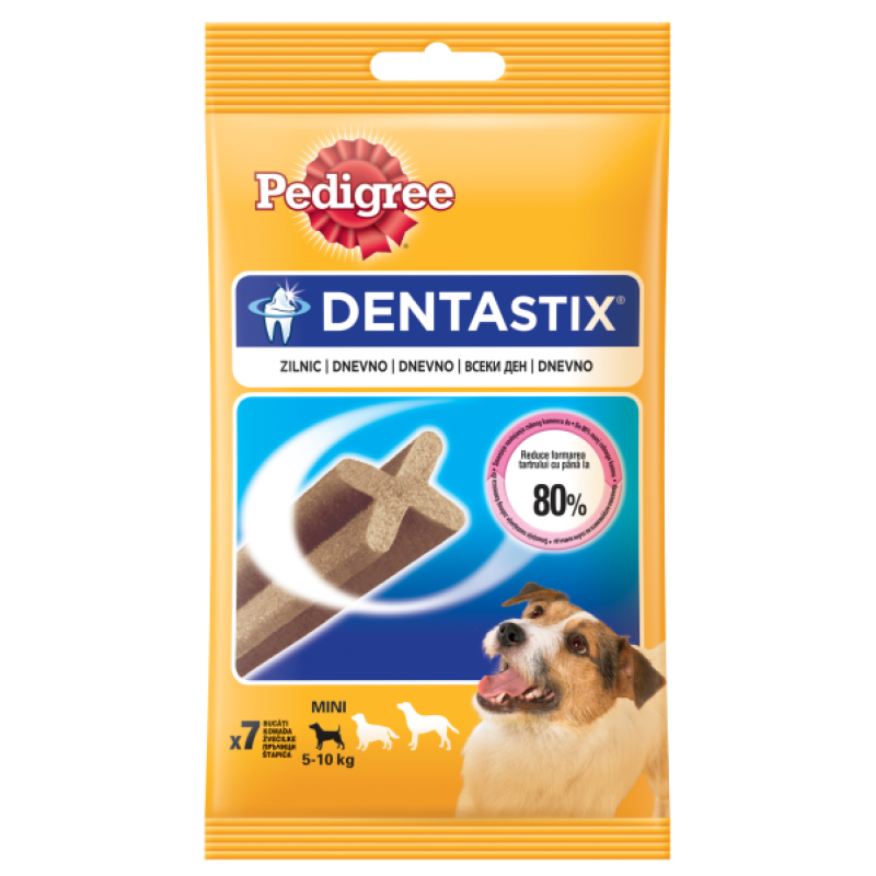Пръчиците Дентастикс спомагат за почистването на зъбите на домашния ви любимец. Специалната им "X" форма, нежната абразивна текстура и активните съставки намаляват натрупването на плака и зъбен камък. Освен това те са вкусни и ще зарадват вашето куче. Лакомството е с ниско съдържание на мазнини, без добавена захар, изкуствени оцветители и аромати. Съдържание: зърнени култури, продукти с растителен произход, минерали /включително 2.3%натриев триполифосфат/, месо и животински продукти, масла и мазнини.
