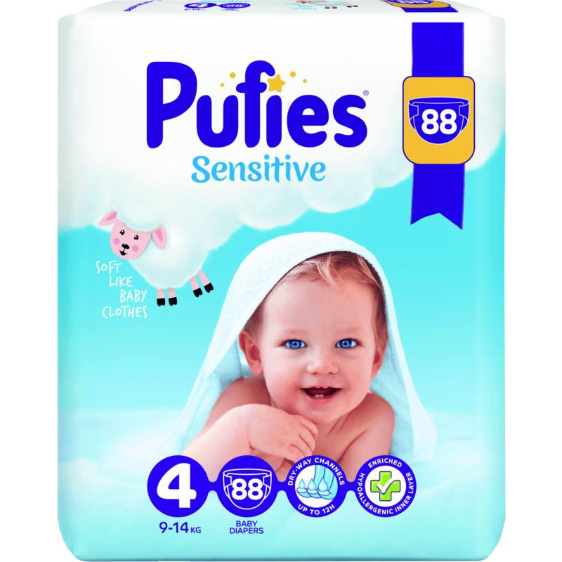 Pufies Sensitive представляват ново поколение пелени с абсорбиращи каналчета за 3 пъти по-бързо попиване в сравнение с предишните пелени Pufies, които са специално създадени да осигурят максимален комфорт и отлична защита срещу протичане. Серията Sensitive, предлага 2 великолепни дизайна в пакет със сладки илюстрации, пелените са с анатомична форма, която следва всяко движение на бебето, осигуряваща допълнително удобство без значение дали то спи, играе или изследва света около себе си. Пелените са с точно прилягащи ластици, а областта oкoлo крaчeтaтa e зaщитeнa cъс специални бариери, които не допускат протичане. Pufies Sensitive са изработени от изключително мека и тънка материя, която позволява пелената да диша, тя остава суха дълго време, а нежната бебешка кожа е предпазена от запарване, зачервяване и подсичане. Специалната система за усвояване на влагата, попива изцяло течността и действа като бариера, за да защити бебешката кожа, оставяйки трайно чувство на комфорт и сигурност, а горният слой е създаден от копринени фибри, обогатен с лайка и алое вера, което спомага за намаляване риска от раздразнения.