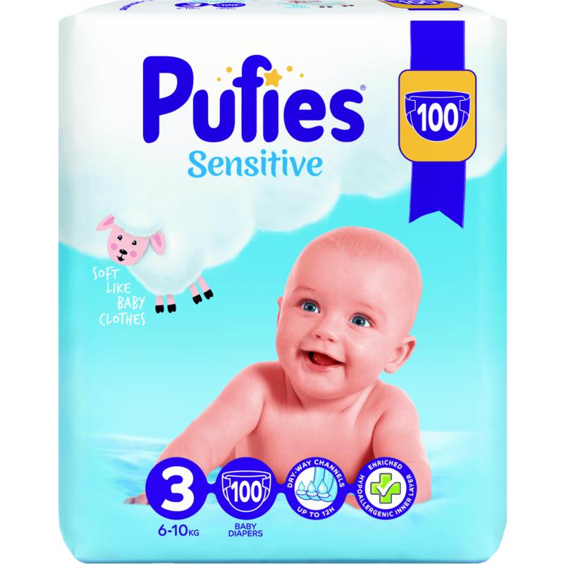 Pufies Sensitive представляват ново поколение пелени с абсорбиращи каналчета за 3 пъти по-бързо попиване в сравнение с предишните пелени Pufies, които са специално създадени да осигурят максимален комфорт и отлична защита срещу протичане. Серията Sensitive, предлага 2 великолепни дизайна в пакет със сладки илюстрации, пелените са с анатомична форма, която следва всяко движение на бебето, осигуряваща допълнително удобство без значение дали то спи, играе или изследва света около себе си. Пелените са с точно прилягащи ластици, а областта oкoлo крaчeтaтa e зaщитeнa cъс специални бариери, които не допускат протичане. Pufies Sensitive са изработени от изключително мека и тънка материя, която позволява пелената да диша, тя остава суха дълго време, а нежната бебешка кожа е предпазена от запарване, зачервяване и подсичане. Специалната система за усвояване на влагата, попива изцяло течността и действа като бариера, за да защити бебешката кожа, оставяйки трайно чувство на комфорт и сигурност, а горният слой е създаден от копринени фибри, обогатен с лайка и алое вера, което спомага за намаляване риска от раздразнения.