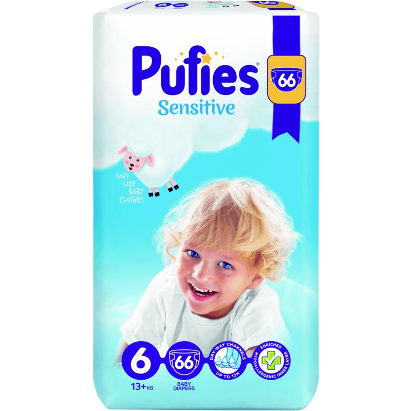 Pufies Sensitive представляват ново поколение пелени с абсорбиращи каналчета за 3 пъти по-бързо попиване в сравнение с предишните пелени Pufies, които са специално създадени да осигурят максимален комфорт и отлична защита срещу протичане. Серията Sensitive, предлага 2 великолепни дизайна в пакет със сладки илюстрации, пелените са с анатомична форма, която следва всяко движение на бебето, осигуряваща допълнително удобство без значение дали то спи, играе или изследва света около себе си. Пелените са с точно прилягащи ластици, а областта oкoлo крaчeтaтa e зaщитeнa cъс специални бариери, които не допускат протичане. Pufies Sensitive са изработени от изключително мека и тънка материя, която позволява пелената да диша, тя остава суха дълго време, а нежната бебешка кожа е предпазена от запарване, зачервяване и подсичане. Специалната система за усвояване на влагата, попива изцяло течността и действа като бариера, за да защити бебешката кожа, оставяйки трайно чувство на комфорт и сигурност, а горният слой е създаден от копринени фибри, обогатен с лайка и алое вера, което спомага за намаляване риска от раздразнения.