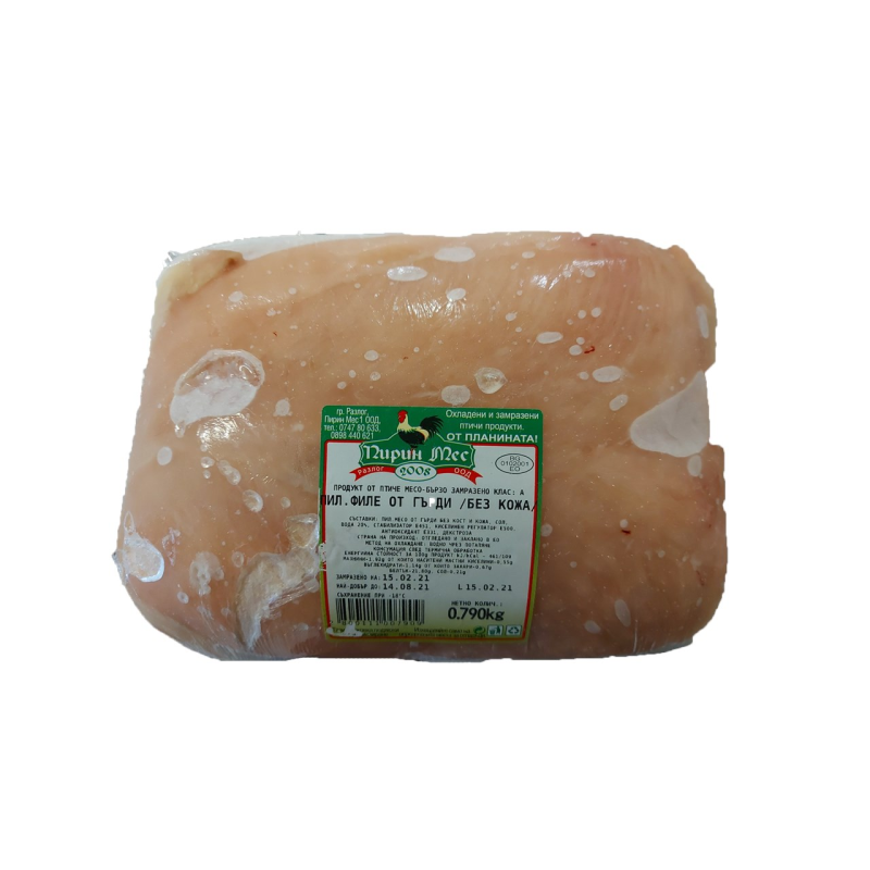 Съставки: пилешко месо от гърди без кост и кожа, сол, вода 20%, стабилизатор Е451, киселинен регулатор Е500, антиоксидант Е331, декстроза. Метод на охлаждане: водно чрез потапяне.