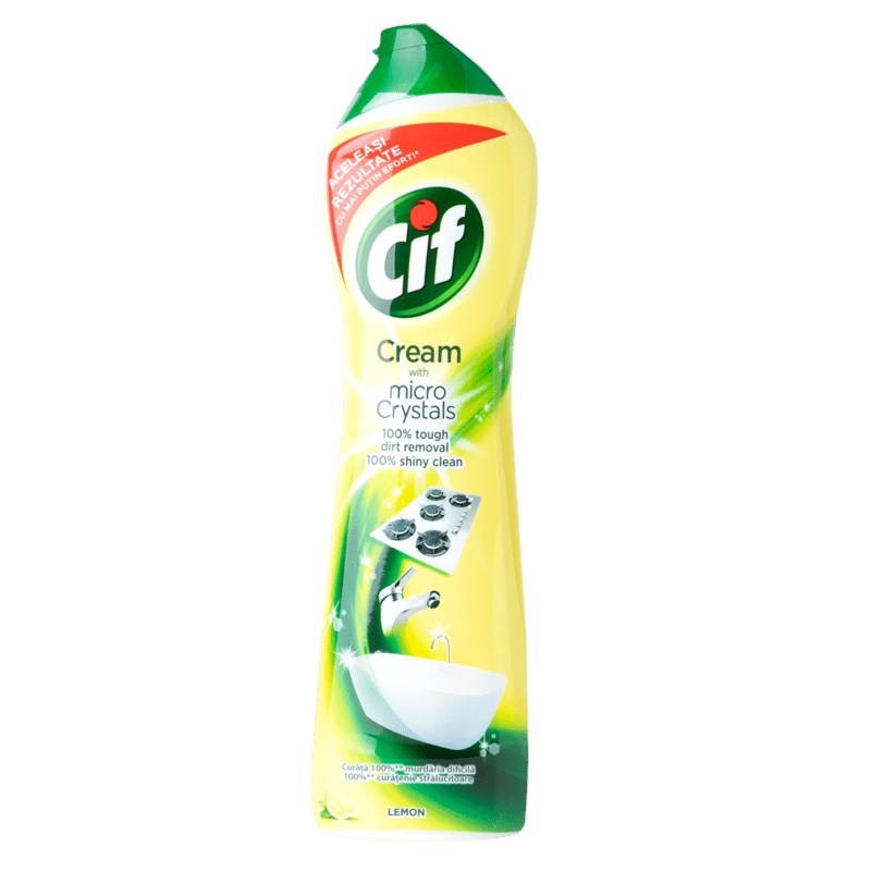 Крем Cif лимон със свеж цитрусов аромат. Пълен с милиони естествени почистващи частици. Този многофункционален почистващ препарат за повърхност премахва 100% твърда мръсотия за красиво чисто покритие на редица повърхности. Може да се използва като почистващо средство за кухня, за почистване на плотове, мивки и кухненски плочки, както и почистващо средство за баня за почистване на вани, мивки и плочки за баня. Формулата на Cif Cream сега е по-добра от всякога и работи без усилия, за да оставите повърхностите си с искрящо покритие и 100% блясък, който със сигурност ще ви накара да се усмихнете. И сега благодарение на новата си текстура, тя изисква по-малко изплакване.