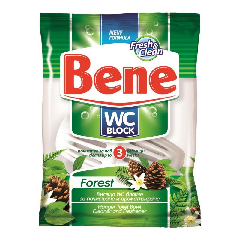 Бене WC блок е ароматизатор за тоалетни чинии. Блокчето отстранява замърсяването и отлаганията от урина и карбонати по стените на фаянсовите чинии. Балансираната му формула осигурява отличен измиващ ефект с над 10 дни трайност на действието, на изключително разумна цена. В помещението остава траен фин аромат