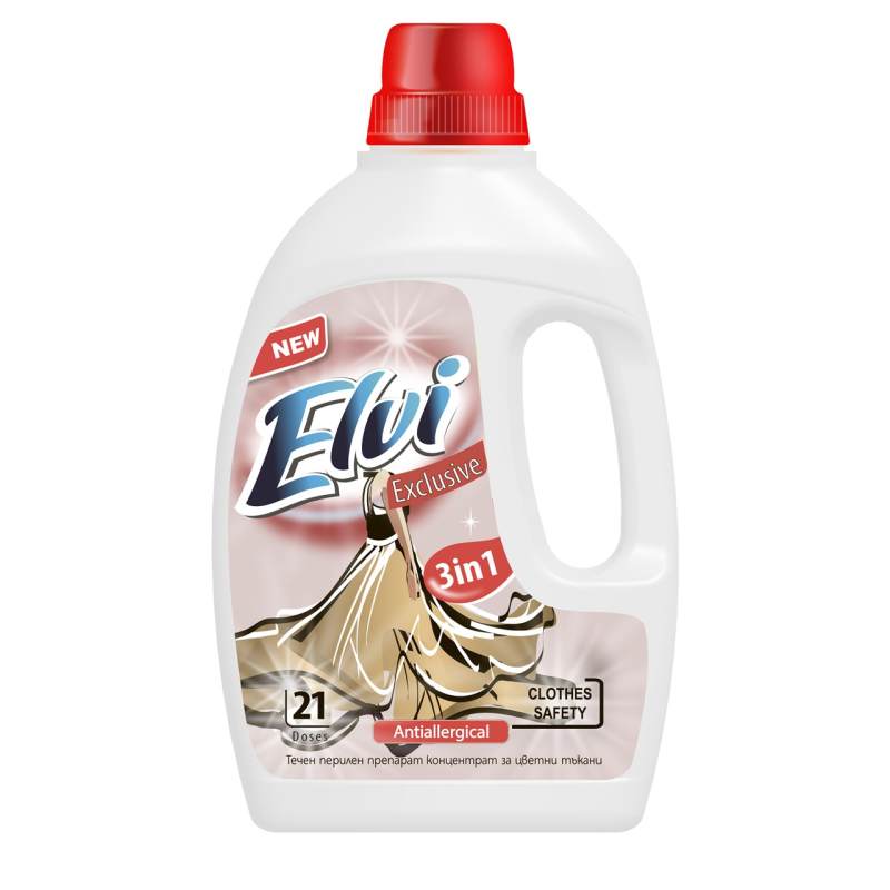 Елви течен перилен препарат за цветни тъкани е концентрат за машинно пране на цветни тъкани. Високата концентрация на активни вещества гарантира отлично изпиране с минимално количество препарат. Продуктът има тройна активна система, която осигурява неотделяне на цветовете от тъканите и запазване на тяхната яркост. За третиране на петна, тъканта се намазва с препарата и преседява 30-60 минути, след което се изпира с останалото пране в машината. За запазване на цветовете се препоръчва пране при температури до 40 градуса по Целзий. След употреба оставя траен и приятен аромат.