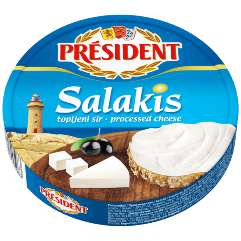 За любителите на по-нестандартните вкусове представяме Топеното сирене PRESIDENT Салакис – единственото топено сирене на пазара с нотка на Средиземноморие. С приятно изразен вкус и с гладка текстура, продуктът е идеален за намазване и за приготвяне на разядки и сосове.