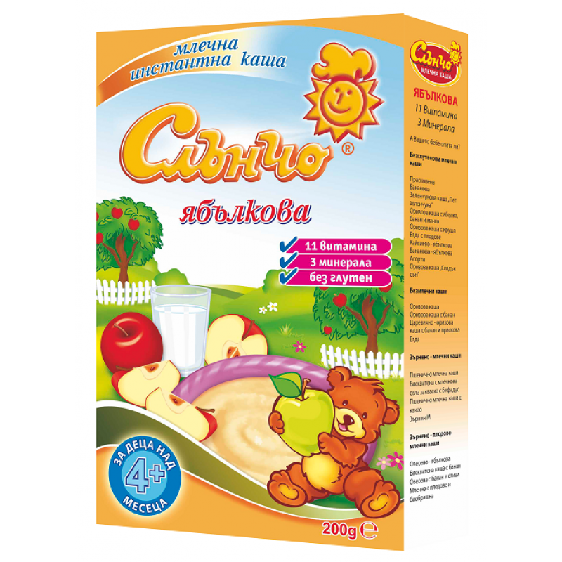 Състав:царевично нишесте, оризово брашно, сухо пълномаслено мляко* (18,7%), пюре от ябълка (14,6%), суха сладка суроватка*, захар, витаминно – минерална смес ((Витамин А(ретинил ацетат), Витамин D3 (холекалциферол), Витамин Е (алфа токоферол ацетат), Витамин С (L-аскорбинова киселина), Витамин В1 (тиамин мононитрат), Витамин В2(рибофлавин), Ниацин (никотинамид), Витамин В6 (пиридоксин хидрохлорид), Витамин В9 (фолиева киселина), Витамин В12 (цианокобаламин), Пантотенова киселина (калциев D-пантотенат), Желязо (железен пирофосфат), Цинк (цинков сулфат), Йод (калиев йодид)).