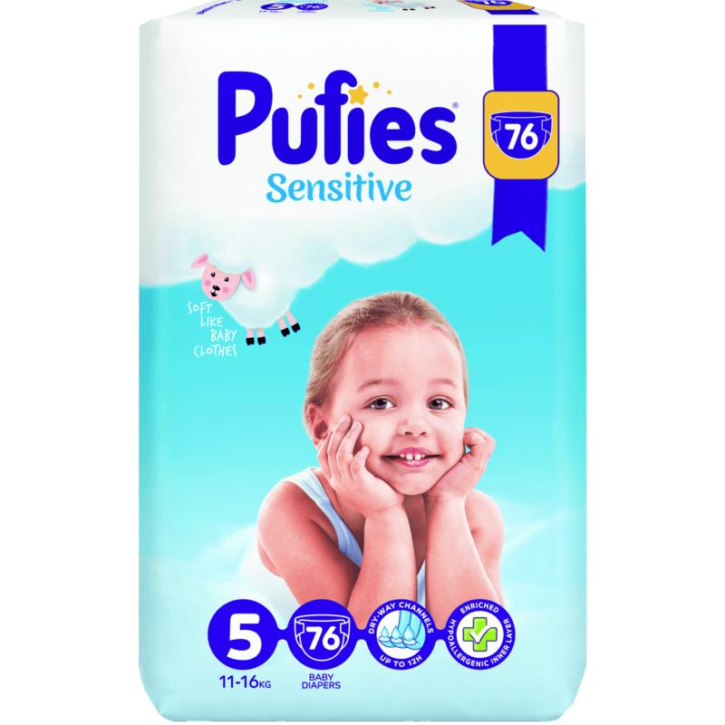 Pufies Sensitive представляват ново поколение пелени с абсорбиращи каналчета за 3 пъти по-бързо попиване в сравнение с предишните пелени Pufies, които са специално създадени да осигурят максимален комфорт и отлична защита срещу протичане. Серията Sensitive, предлага 2 великолепни дизайна в пакет със сладки илюстрации, пелените са с анатомична форма, която следва всяко движение на бебето, осигуряваща допълнително удобство без значение дали то спи, играе или изследва света около себе си. Пелените са с точно прилягащи ластици, а областта oкoлo крaчeтaтa e зaщитeнa cъс специални бариери, които не допускат протичане. Pufies Sensitive са изработени от изключително мека и тънка материя, която позволява пелената да диша, тя остава суха дълго време, а нежната бебешка кожа е предпазена от запарване, зачервяване и подсичане. Специалната система за усвояване на влагата, попива изцяло течността и действа като бариера, за да защити бебешката кожа, оставяйки трайно чувство на комфорт и сигурност, а горният слой е създаден от копринени фибри, обогатен с лайка и алое вера, което спомага за намаляване риска от раздразнения.