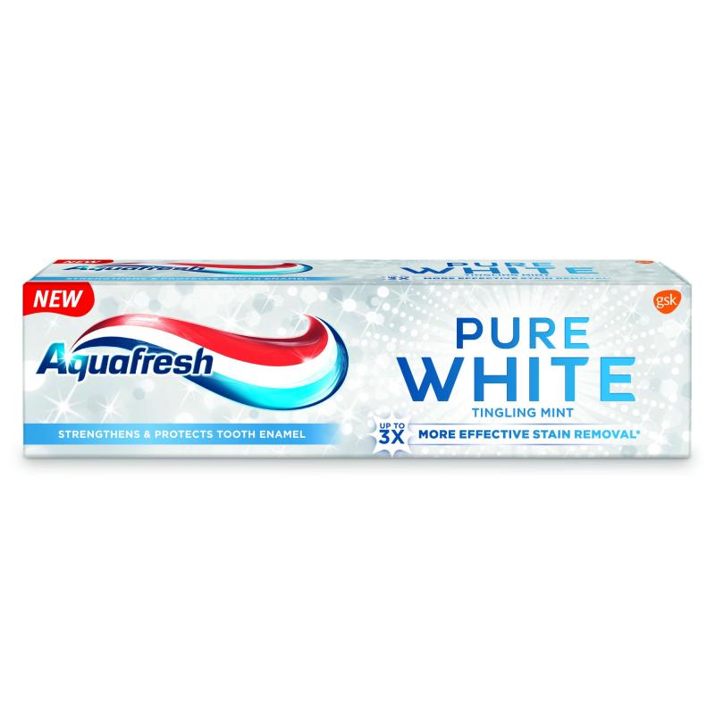 Aqua, Sorbitol, Hydrated Silica, Glycerin, Pentasodium Triphosphate, PEG-6, Alumina, Sodium Lauryl Sulfate, Aroma, Xanthan Gum, Cocamidopropyl Betaine, Sodium Citrate, Titanium Dioxide, Carrageenan, Sodium Fluoride, Zinc Chloride, Sodium Saccharin, Sodium Hydroxide, Limonene, CI 74160, CI 74260.Aquafresh Pure White Soft Mint паста за зъби 75 мл е уникална паста за зъби, съдържаща съставки, които избелват зъбите три пъти по-добре от традиционните пасти за зъби. Формулата ? е изработена така, че микро перлите да достигнат и до най-трудните места и да се погрижат и за тях. Петната от кафе, сладко, червено вино и всяка една оцветяваща храна нямат шанс да оцелеят. Аквафреш Пюр Уайт Софт Минт паста за зъби 75 мл има ментов вкус, който допълва усещането за чистота. Ако искате да имате незаменима усмивка и искрящо бели зъби, това е вашата паста. Не съдържа захар! Съдържа флуорид!