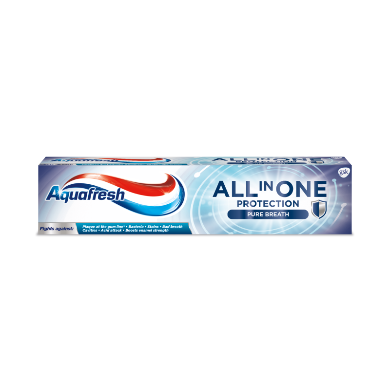 Пастата за зъби Оул ин Уан Протексън Пюр Брет от Аквафреш осигурява цялостна защита на устната кухина и оставя свеж ментов вкус. Тя защитава от кариес, подсилва емайла и отстранява петната. Бори се с плаката, заздравява венците и има антибактериално действие. Благодарение на съдържащия се флуорид, пастата изгражда защитен слой, който предпазва повърхността на зъбите от атаките на киселините от захарите през целия ден.