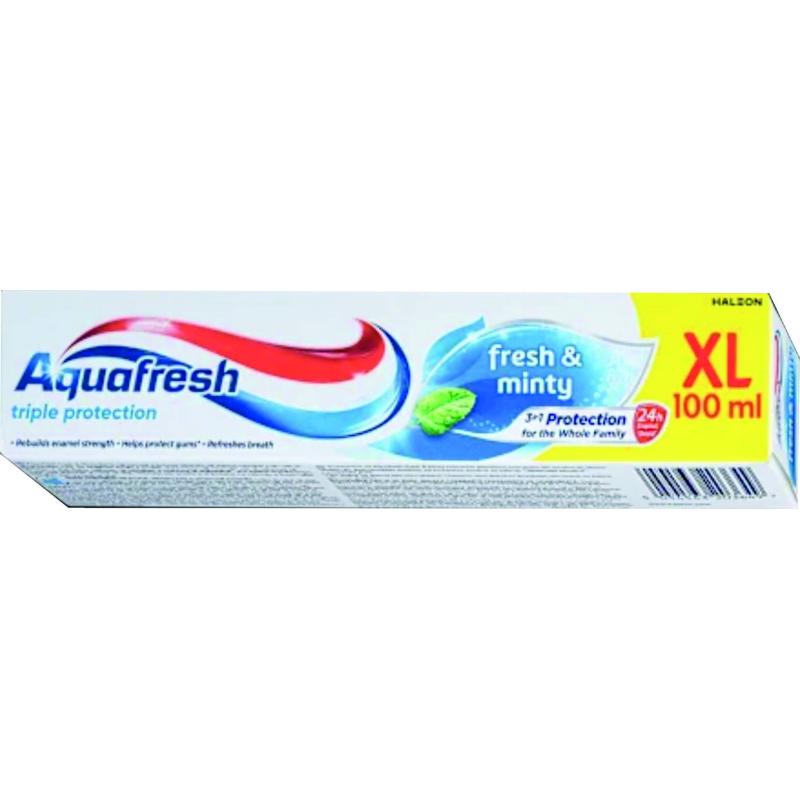 АКВАФРЕШ ПАСТА ЗА ЗЪБИ ТРОЙНА ЗАЩИТА FRESH&MINTY СИНЯ 100МЛ 2811005 е свежа семейна паста за зъби с тройна защита, съдържаща флуорид, която предпазва от появата на кариеси, като елиминира захарните киселини и плаката. Съдържащите се активни минерали в Аквафреш Тройна защита се абсорбират в зъбите, като спомагат за тяхното подсилване и ги укрепват отвътре навън. AquaFresh Triple Protection Fresh & Minty създава защитен щит, който помага да се блокира атаката на захарната киселина през целия ден. С изключително свеж ментов аромат.