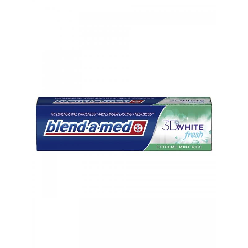 Blend-а-Med 3D White Fresh Extreme Mint Kiss e паста за зъби, която помага за избелването на зъбите и освежаването на дъха. Формулата премахва плаката и бактериите от повърхността на езика, венците и зъбите, като осигурява дълготрайна свежест. Благодарение на микрогранулите, които достигат до труднодостъпните места, зъбите ви остават добре почистени и бели. В състава на пастата има силициев диоксид, който по безвреден начин полира и избелва емайла на зъбите.