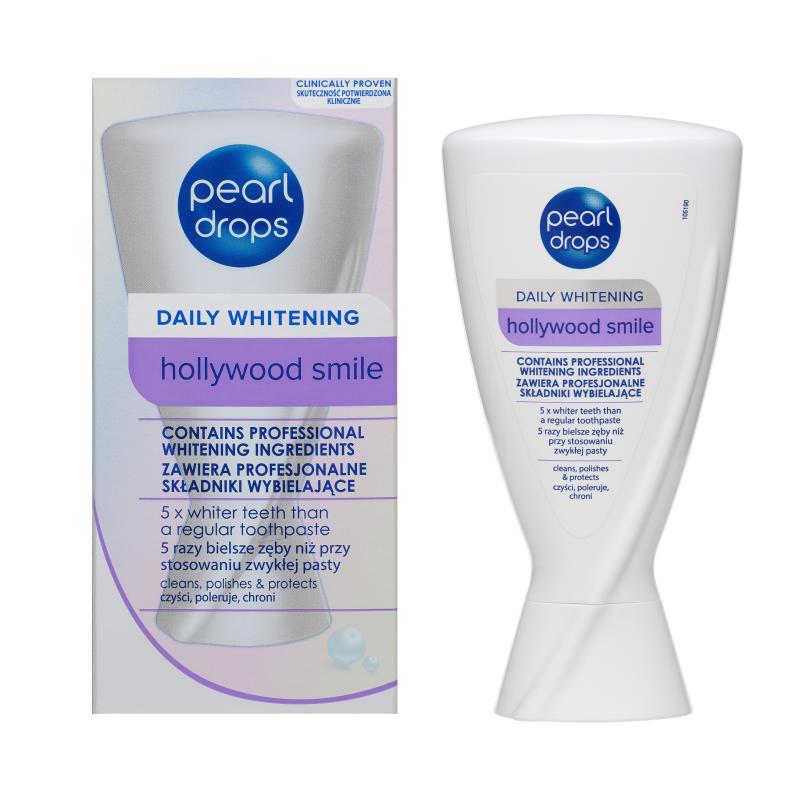 Състав:Sorbitol, Aqua, Hydrated Silica, Glycerin, Alumina, Sodium Dodecylbenzenesulfonate, Peg-12, Aroma, Pentasodium Triphosphate, Pentapotassium Triphosphate,Zinc Peroxide, Cellulose Gum, Sodium Fluoride, Sodium Saccharin, Pearl Powder, Limonene, Ci 74160, Ci 77891.Pearl Drops Hollywood Smile Daily Whitening е избелваща паста за зъби, която осигурява до 5 пъти по-блестящо бяла усмивка в сравнение с обикновените пасти. Специалната формула е подсилена с активен кислород, който поддържа белотата и премахва съществуващите петна и плака. Същевременно съдържащият се флуорид укрепва емайла и предпазва от появата на кариеси. Деликатната текстура на пастата е приятна за употреба. След използване на Пърл Дропс Холивуд Избелваща паста за зъби, зъбите са оптимално почистени, освежени и защитени, с неустоим дъх и възхитителен външен вид. Съдържа натриев флуорид (1300 ppm F).