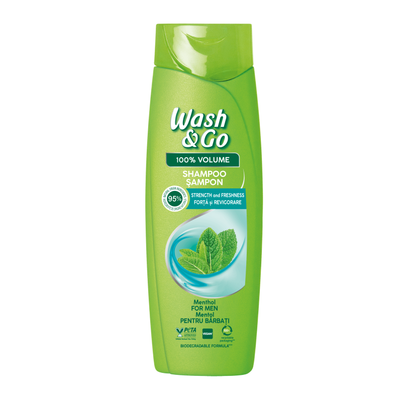 Уош & Гоу Мъжки шампоан с ментол за всеки тип коса има тонизиращо и охлаждащо действие и осигурява дълготрайно усещане за свежест. С ментолов аромат. Дерматологично тестван продукт.