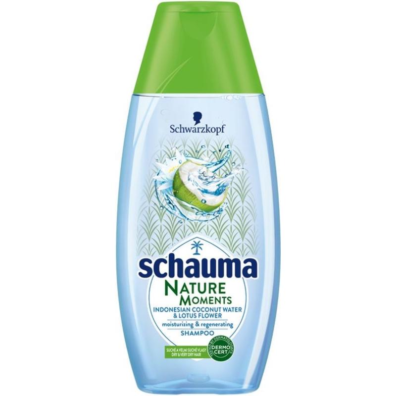 Schauma Nature Moments Shampoo е специално създаден ревитализиращ шампоан с кокосова вода и цвят от лотос, предназначен за ежедневна употреба, който придава обем и възвръща плътноста на косъма. Продуктът е с изключително лека формула и свеж, успокояващ аромат, като в същото време почиства без да утежнява, прави косата да изглежда по-плътна и обемна. След употребата на шампоана косата ви ще бъде мека, красива и бляскава. Не съдържа силикони и изкуствени оцветители.