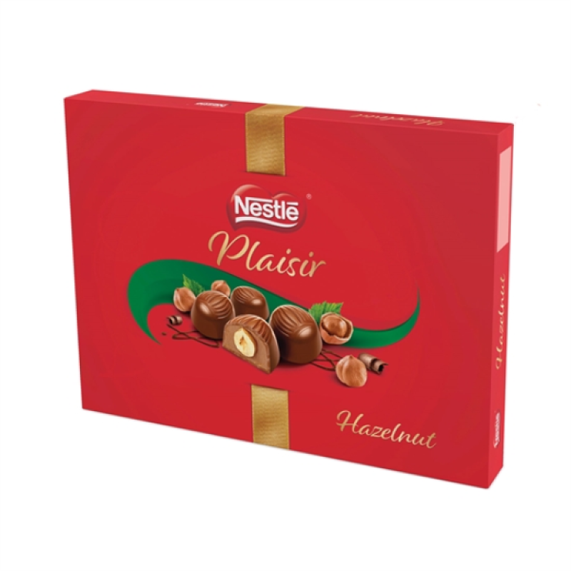 Описаие: Шоколадови бонбони с черупка от млечен шоколад 53% и пълеж от лешников крем 37,5% и цели лешници 7,5%.