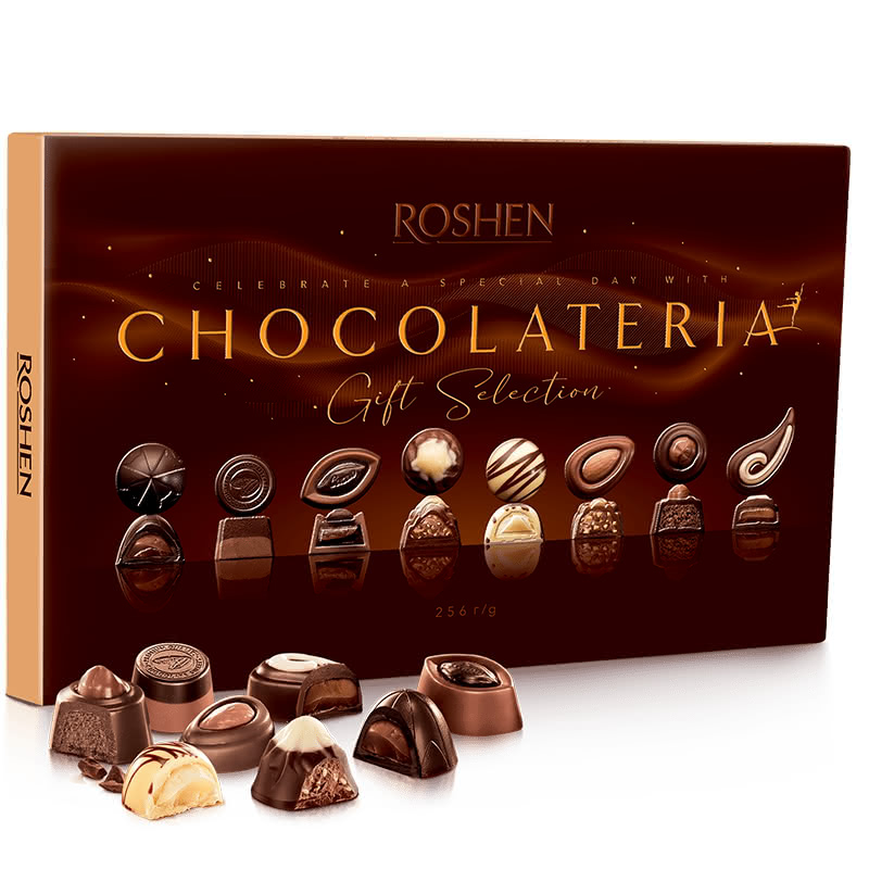 Съставки: МИКС ОТ ШОКОЛАДОВИ И ПРАЛИНИ БОНБОНИ "ROSHEN CHOCOLATERIA".В микса са включени бонбони от млечен, бял и черен шоколад с пълнеж: фондан с бренди (34% пълнеж), лешникова паста (34% пълнеж), винен трюфел (33% пълнеж), бял трюфел (37% пълнеж), фондан с бренди и аромат на кафе (40% пълнеж), бонбони: със сусам, с бадеми, двупластови с лешников вкус.Хранителни стойности за 100 г Енергийност (ккал/ kJ) 54 / 2230 Въглехидрати (г) 48 от които захари (г) 44,3 Мазнини (г) 34 от които наситени (г) 19,1 Протеини (г) 6 Сол (г) 0,09