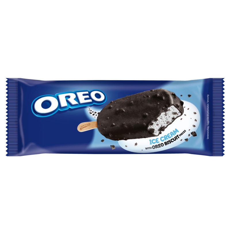 Сладолед с вкус на ванилия, гарниран с парченца какаови сандвич бисквитки с пълнеж, с вкус на ванилия, покрит с глазура с малки парченца какаови сандвич бисквитки с пълнеж, с вкус на ванилия