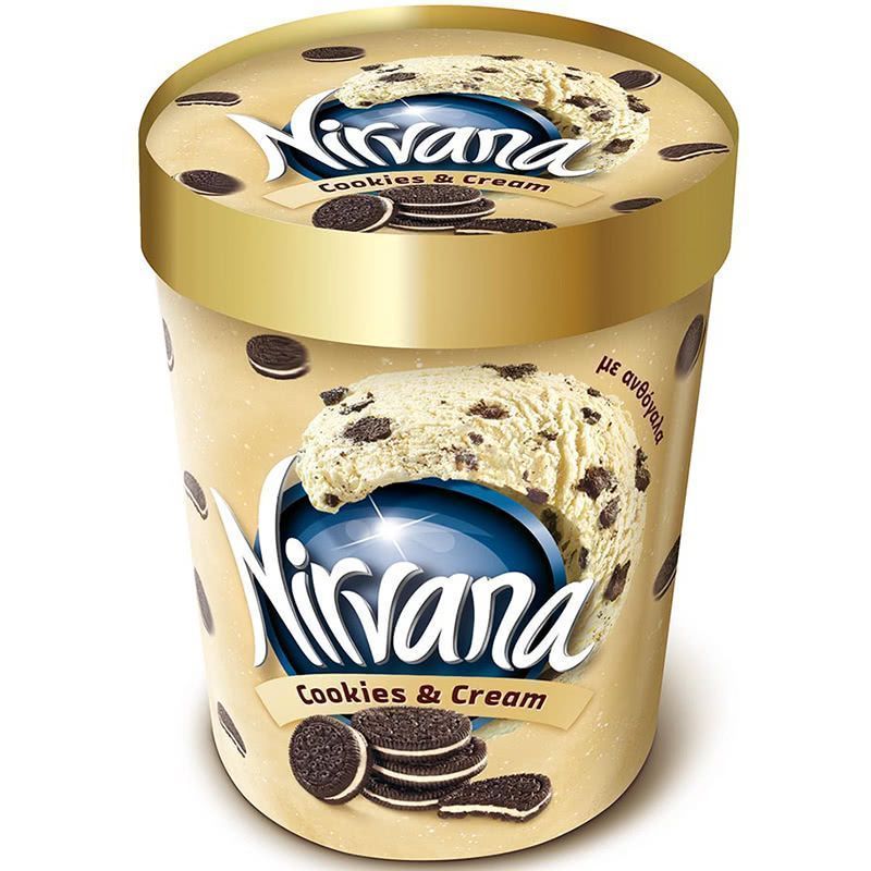 Сладолед с вкус на ванилия, с парченца какаови бисквити със сметанов пълнеж.