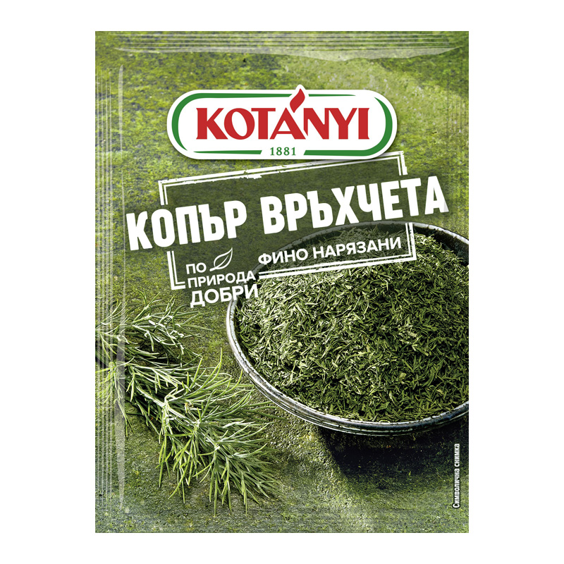 Копърът е известен по света със своя отличителен, силен аромат и леко анасонов, сладникав вкус. Удивително фините Връхчета копър КОТАНИ са обработени по най-щадящ начин и развиват своя типичен вкус веднага щом се смесят с олио или вода. Като пресни!