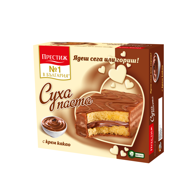 Съставки: захар, питейна вода, пшенично брашно, сироп от глюкоза, частично хидрогенирани растителни мазнини (мазнини- палмова, соева, рапична, слъчногледова, емулгатори- сорбитан, тристеарат, соев лецитин), нехидрогенирани растителни мазнини (мазнини-палмова, ший, емулгатори - моно и диглицериди на мастни киселини, соев лецитин, ароматизант), суроватка на прах влагозадържащи агенти (глицерин, сорбитол), какао на прах с намалено маслено съдържание -2%, пастьоризиран яйчен меланж, обезмаслено мляко на прах, сол, набухватели (натриев бикарбонат, натриев кисел пирофосфат, монокалциев фосфат), регулатор на киселинността (лимонена киселина), консервант (калиев сорбат), оцветители (бета каротин), емулгатори (рапичен лецитин, моно- и диглицериди на мастни киселини, пропилен гликол естери на мастни киселини, полиглицерол полирицинолеат, гума ксантан) етанол, царевично нишесте
