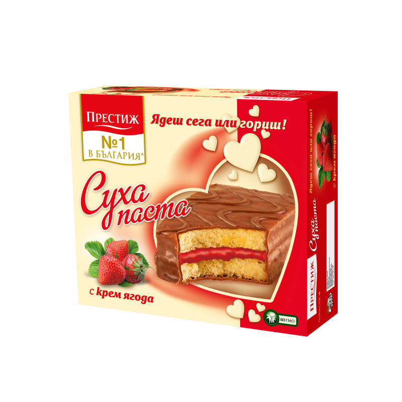 Състав: захар, питейна вода, пшенично брашно, сироп от глюкоза, частично хидрогенирани растителни мазнини (мазнини- палмова, соева, рапична, слъчногледова, емулгатори- сорбитан, тристеарат, соев лецитин), нехидрогенирани растителни мазнини (мазнини-палмова, ший, емулгатори - моно и диглицериди на мастни киселини, соев лецитин, ароматизант), влагозадържащи агенти (глицерин, сорбитол), суроватка на прах, плодов пълнеж ягода- 2,3% (ягоди- 0,8%, глюкозо-фруткозен сироп, захар, сгъстител- нишесте, стабилизатор- натриева карбоксиметилцелулоза регулатор на киселинността- лимонена киселина, консервант- калиев сорбат, растителен ароматизант, натурален оцветител- антоцианини), пастьоризиран яйчен меланж, обезмаслено мляко на прах, какао на прах с намалено маслено съдържание, сол, набухватели (натриев бикарбонат, натриев кисел пирофосфат, монокалциев фосфат), регулатор на киселинността (лимонена киселина), консервант (калиев сорбат), оцветители (бета каротин, бетанин), емулгатори (рапичен лецитин, моно и диглицериди на мастни киселини, пропилен гликол естери на мастни киселини, полиглицерол полирицинолеат, гума ксантан), етанол, царевично нишесе, ягодов ароматизант. Може да съдържа следи от фъстъци, сусамово семе и ядки (лешници, орехи, пеканови ядки).