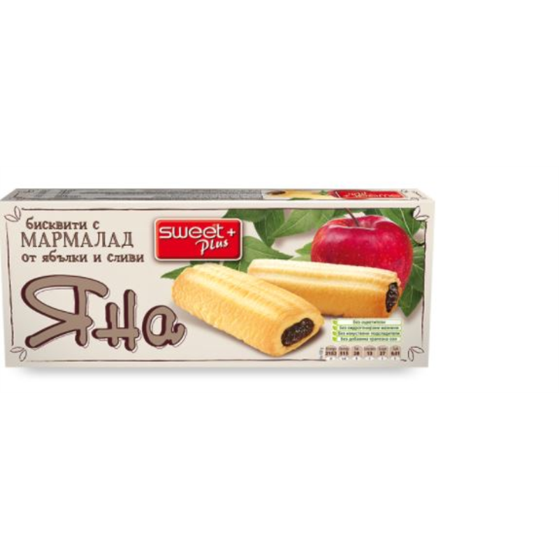 Съставки: Пшенично брашно, растителна мазнина палмова, мармалад от ябълки и сливи 20%, (захар, сироп от глюкоза, сливи 33%, ябълки 22%, желиращ агент: пектин, киселина: лимонена, консервант: калиев сорбат), захар, яйчен меланж, ароматизант: лимон.