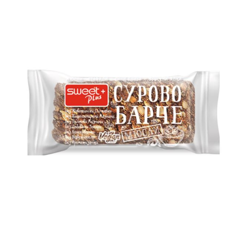 Съставки: стафиди 63,8%, овесени ядки 10,6%, корнфлейкс, сини сливи 6,4%, мюсли с плодове (стафиди 15%, банани 7%, ябълки 2%, папая 1%, ананас 1%, сливи 1%), ленено семе, слънчогледови семки. Наличието на захари се дължи на естествено съдържащите се в храната захари. Съдържанието на сол се дължи изключително на наличието на естествено съдържащ се в храната натрий.