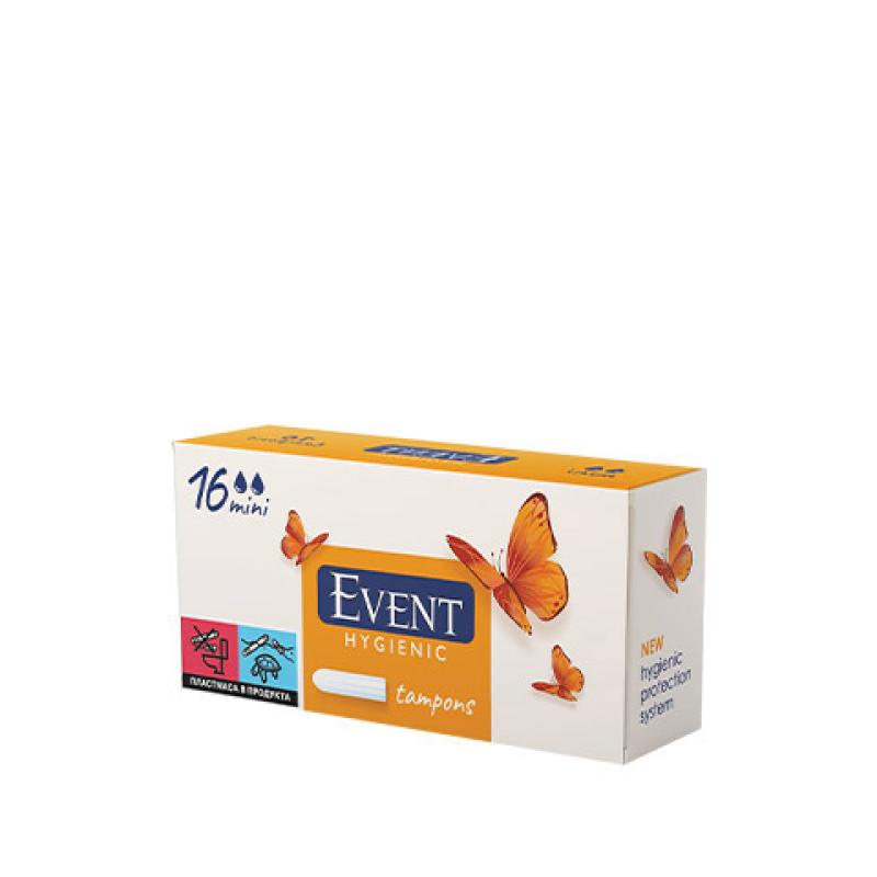 Дамските тампони Евент Мини са предназначени за жени и девойки със слаба менструация. Изработени са от естествени влакна с висока хигроскопичност. Имат 8 каналчета за по-бързо абсорбиране на течността. С нежно заоблен връх за лесно поставяне и отстраняване. Гладка повърхност, благодарение на фината покривна капсула на тампона, което не позволява попадането на власинки в тялото и осигурява компактност и стабилност дори при отстраняването на тампона. Осигуряват комфорт и надеждна защита.