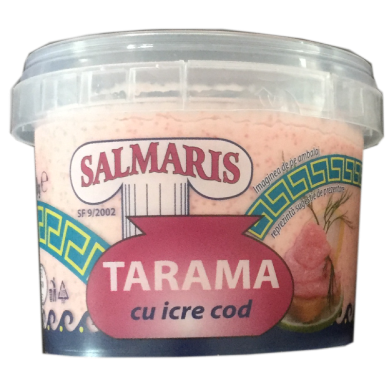 Съставки: тарама хайвер от риба треска ( Gadus morhua) - 26%, растително рапично олио, вода, концентриран сок от лимон (съдържа сулфити), галета (пшенично брашно, вода, мая, сол), захар, сол, оцветители: кармин, екстракт от паприка, консерванти: калиев сорбат,натриев ацетат, натриев бензонат, сгъстители: гума гуар, ксантова гума