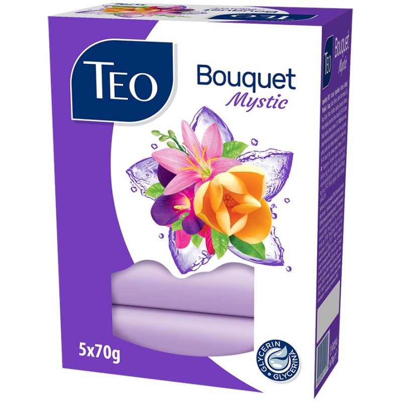 Teo Bouquet Mystic Glycerin Formula Soap е специално създаден подхранващ сапун с аромат на люляк, предназначен за ежедневна употреба, който идеално почиства кожата и я дарява с мекота и нежна грижа. Иновативната му формула е обогатена с глицерин, известен с нежната си грижа към кожата и дълбоко овлажняващият ефект. Уникалният сапун на Тео обгръща кожата ви с мека и нежно ароматизирана пяна, която оставя кожата подхранена и мека като коприна. Употребата на продукта оставя след себе си уникално чувство на свежест, чистота и мекота.