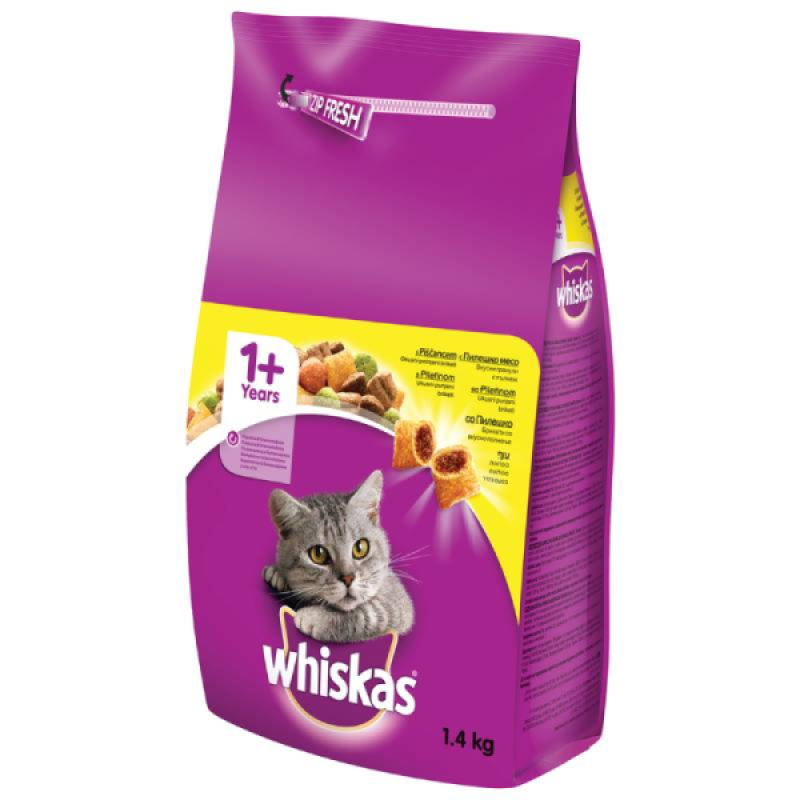Съдържание: Зърнени храни, месо и месни продукти (от които 4% пилешко в светлокафевите гранули), вторични растителни продукти, масла и мазнини, растителни белтъчни екстракти, минералини вещества, зеленчуци (4% моркови в оранжевите гранули, 4% грах в зелените гранули).