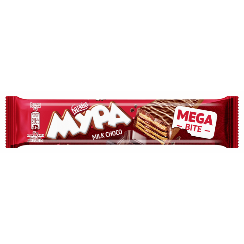 Съставки: млечен шоколад 33,4% (захар, какаово масло, пълномаслено мляко на прах 5,1%, какаова маса, растителни масла (палмово, ший), суроватка на прах (от мляко), емулгатор (лецитини), екстракт от ванилия), палмово масло, захар, пшеничено брашно, суроватка на прах (от мляко), нискомаслено какао на прах 1,1%, обезмаслено мляко на прах 1,1%, набухватели (амониев бикарбонат, натриев бикаронат), малтодекстрин, емулгатори (лецитини, полиглицерол полирицинолеат), сол.