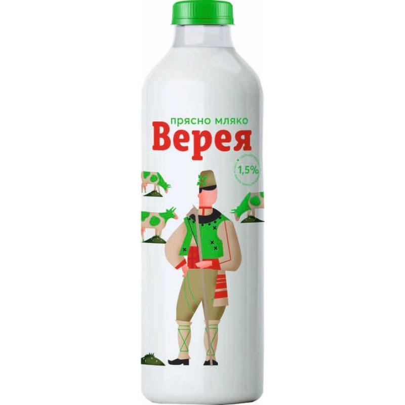 Пастьоризирано прясно краве мляко Верея с 1,5% масленост. То е с понижено съдържание на мазнини, което осигурява добър баланс на здравословни качества и приятен натурален вкус. Не съдържа консерванти. За директна консумация.