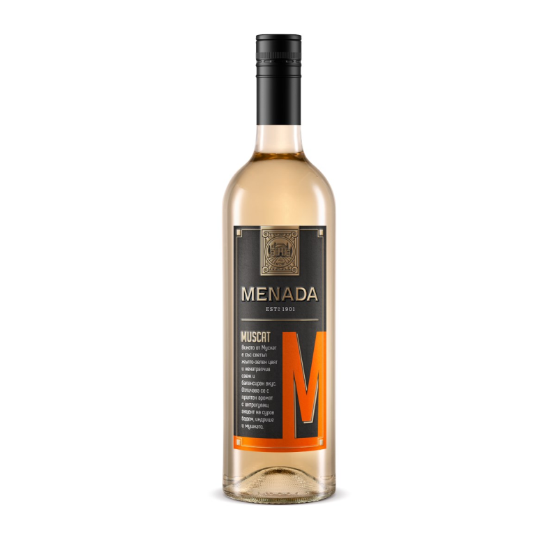 Бяло вино Мускат Менада е българско сухо бяло вино, произведено от сорта Мускат. Отличава със светъл жълто-зелен цвят, ненатрапчив свеж и балансиран вкус, и приятен аромат с акцент на суров бадем, индрише и мушкато. Консумирайте бяло вино Мускат Менада с пилешко месо, ястия от паста и ориз, салата и други.