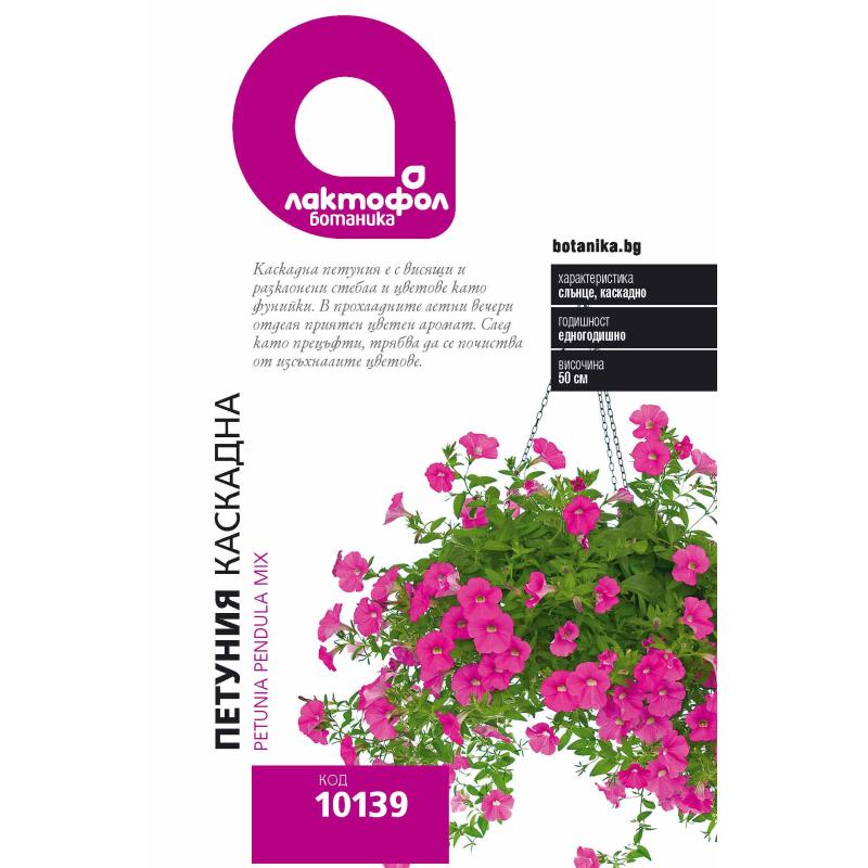 Каскадната петуния, с висящи и разклонени стебла и цветове като фунийки. В прохладните летни вечери отделя приятен цветен аромат. След като прецъфти, трябва да се почиства от изсъхналите цветове. Този сорт петуния е с висящи, гъсти стъбла и по-дребни цветове. Вирее добре на слънчеви места и изисква редовно поливане. Размножава се през февруари-март чрез семена. Петунията с нейното разнообразие от цветове, форми, багри, обилен и продължителен цъфтеж е сред най-популярните растения.