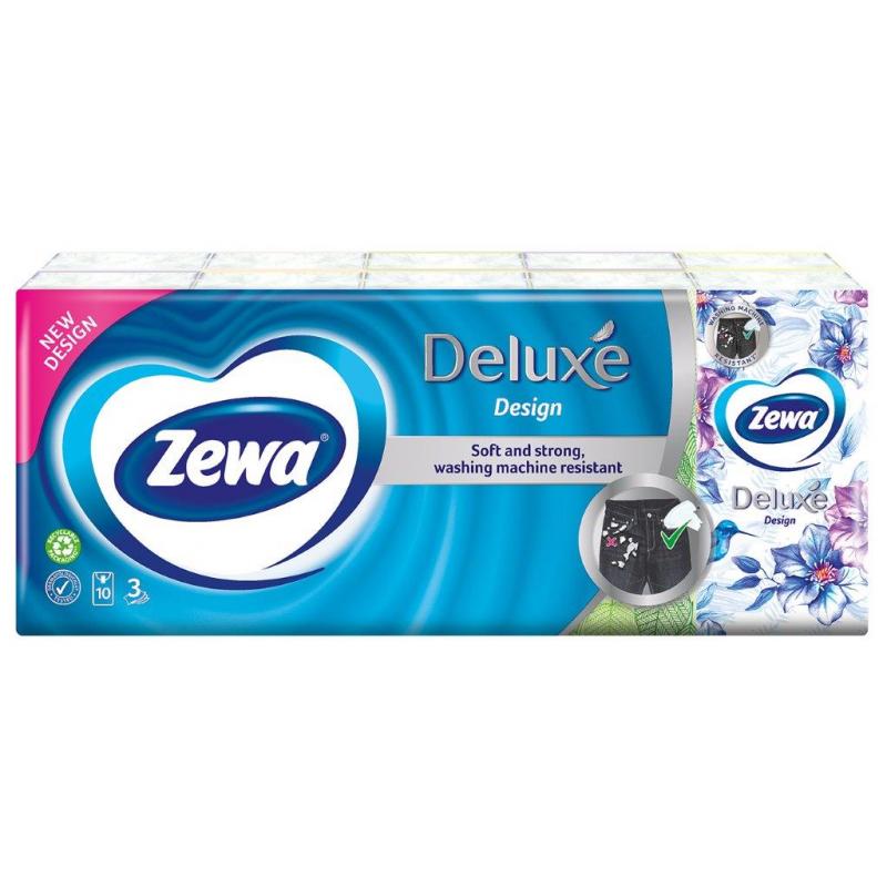 Zewa Deluxe Design са деликатни и здрави 3-пластови носни кърпички без аромат. Не се разпадат, ако ги забравите в джобовете и ги изперете в пералнята. Плътната и висококачествена материя е устойчива дори и на машинно пране. Дерматологично тестван продукт в рециклируема опаковка.