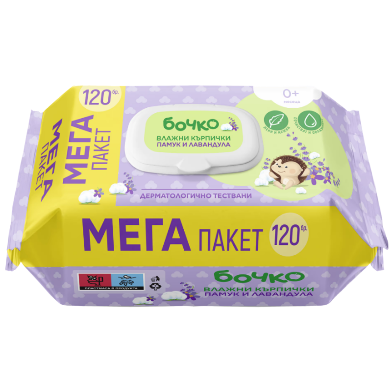 Влажните кърпички Бочко са предназначени за хигиена на бебешка и детска кожа. Идеални при смяна на пелените, при разходка, по време на пътуване, игри и хранене. Подходящи за честа употреба. Напоени с мек лосион на водна основа, с деликатен аромат и с балансирано рН. Без спирт, оцветители и други дразнещи съставки. Активни съставки: Лавандулов екстракт; Екстракт от памук; Витамин Е; Пантенол (провитамин В5)