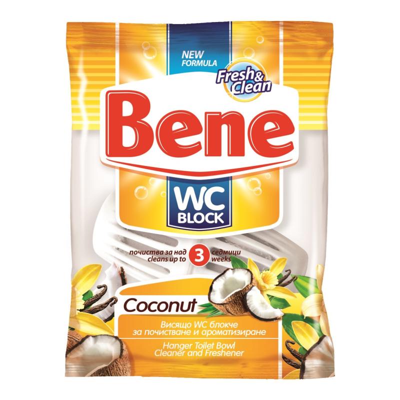 Бене WC блок е ароматизатор за тоалетни чинии. Блокчето отстранява замърсяването и отлаганията от урина и карбонати по стените на фаянсовите чинии. Балансираната му формула осигурява отличен измиващ ефект с над 10 дни трайност на действието, на изключително разумна цена. В помещението остава траен фин аромат