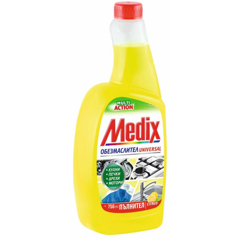 <5% Анионни Пав, <5% Нейоногенни Пав, Фосфати, Парфюм, Edta, Limonene, Citronellol.Концентриран обезмаслител Medix Multi Action е с мощно действие и свеж цитрусов аромат. С мултифункционално приложение, като едновременно е безопасен за тъканите и повърхностите. Почиства до блясък, като премахва без никакво усилие мазнини от различни повърхности в кухнята и градината и дори петна по тъкани.