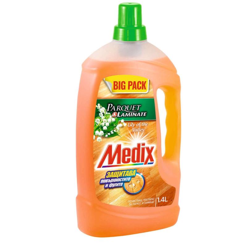 Препарат за паркет и ламинат Medix e препарат за лакирани дървени подове и ламинирани паркети. Медикс за паркети почиства бързо и лесно, без да оставя следи. Специалната формула на препарата се грижи за повърхностите, като ги защитава от влага чрез образуване на предпазен филм. Оставя свеж аромат на момина сълза.